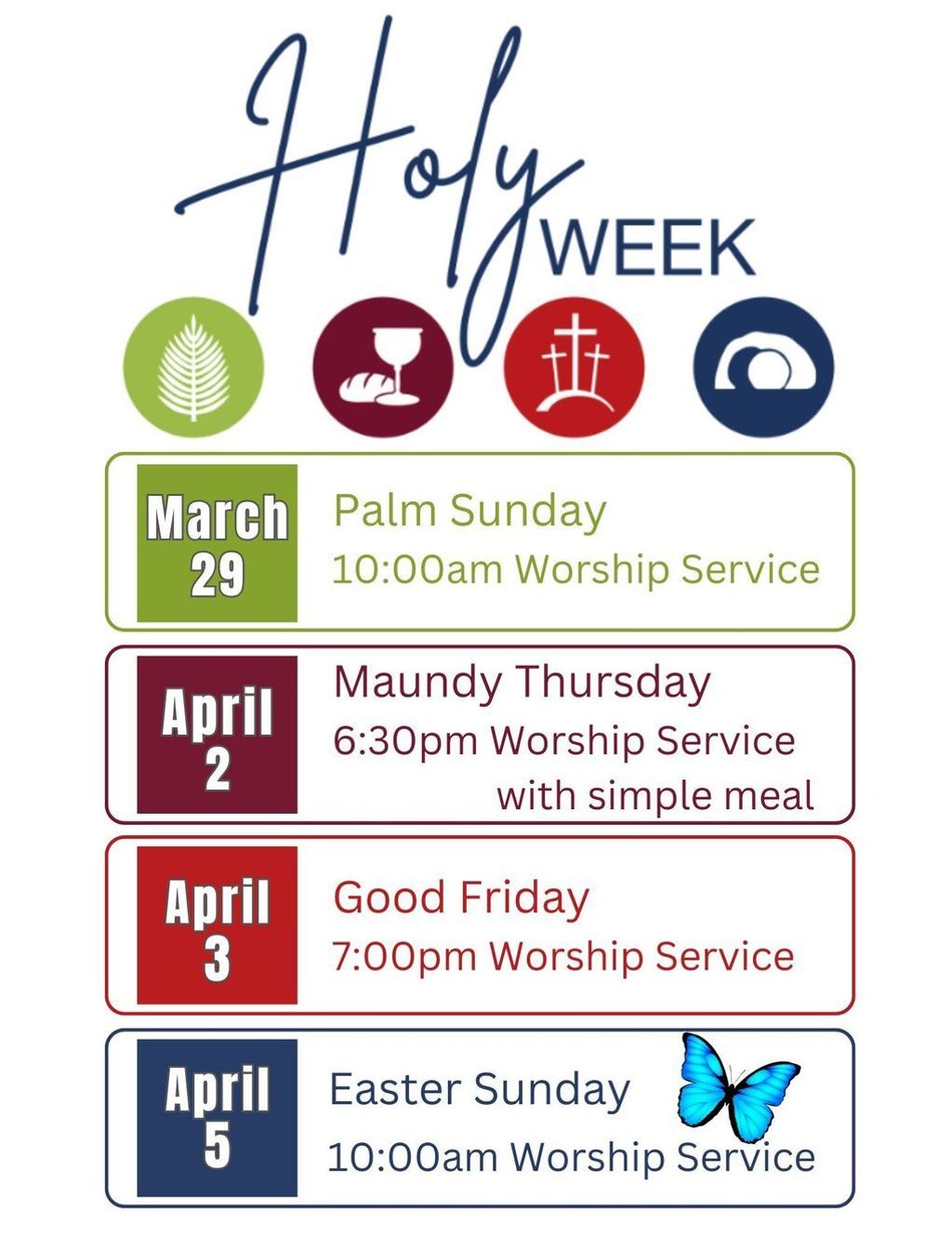 Note: Maundy Thursday service time is earlier than in past, now at 6:30pm and will have a simple meal as part of worship.